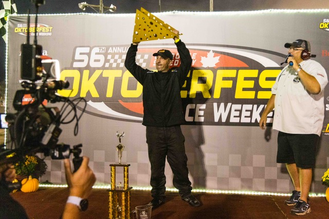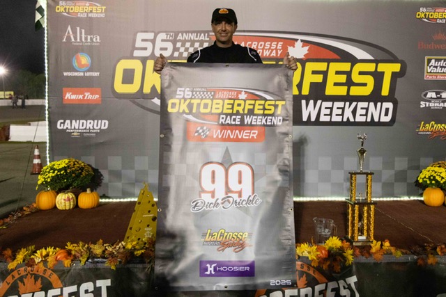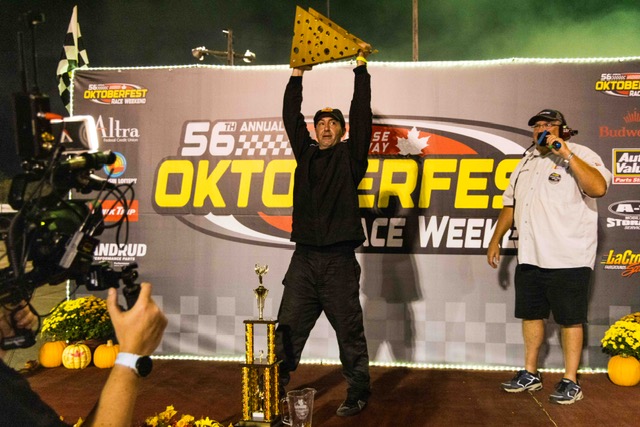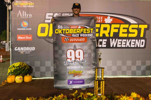 One of the most sought after trophies of the year-end special season of racing has been being declared the champion of the Oktoberfest Race Weekend at the LaCrosse Speedway. The list of champions is a who’s who of racing legends from the past, the current asphalt gladiators and the young lions on the rise. Equally sought after since 2007 has been the Dick Trickle 99 race, the only race that has been given the White Knight’s personal stamp of approval. Some drivers not only have an Oktoberfest title but also a Dick Trickle 99 trophy in their showcases at home. Tonight another of Wisconsin’s elite racers joined an impressive list of winners of both races. Andrew Morrissey dominated the first segment and got to the front halfway through the final segment to add a Dick Trickle 99 cheese trophy to his man cave of racing trophies.