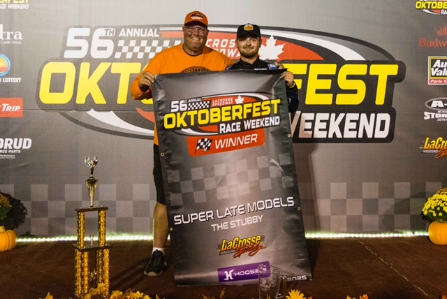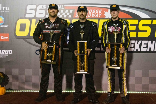The 25 lap main event for the Area Sportsmen saw Bobby Turzinski, Jr. (Mauston, WI) nose ahead of Rick Redig-Tackman (Waukesha, WI) on the first lap, but Redig-Tackman got a good run coming through turns three and four to take firm command of the race at the end of lap two. Chris Weber (West Salem, WI) began to pressure Turzinski, Jr. down the back straight before moving under him to claim second on lap three. With Weber having raced many laps here at LaCrosse and got into a very intense side-by-side fight with Redig-Tackman before zooming into first place on lap nine. Contact between Jason Stark (Wisconsin Dells, WI) and Tadd Labuda (Morris, IL) sent them spinning in turn four to bring out the yellow on lap 12. As Weber pulled away from the field on the restart, Kody Hubred (Cambridge, WI) began looking for a way around Redig-Tackman for second. Hubred was getting a better run through the turns, but it was a better run down the straights that was helping out Redig-Tackman. Contact between the two with eight laps to go in turn two sent them up the track and gave Hubred a flat tire. The result of that incident was a new second place battle between Nick Bruley (Johnson Creek, WI) and Dusty Mann (Farmington, MN). Weber held a full straightaway lead as he claimed his first ever Oktoberfest feature triumph.